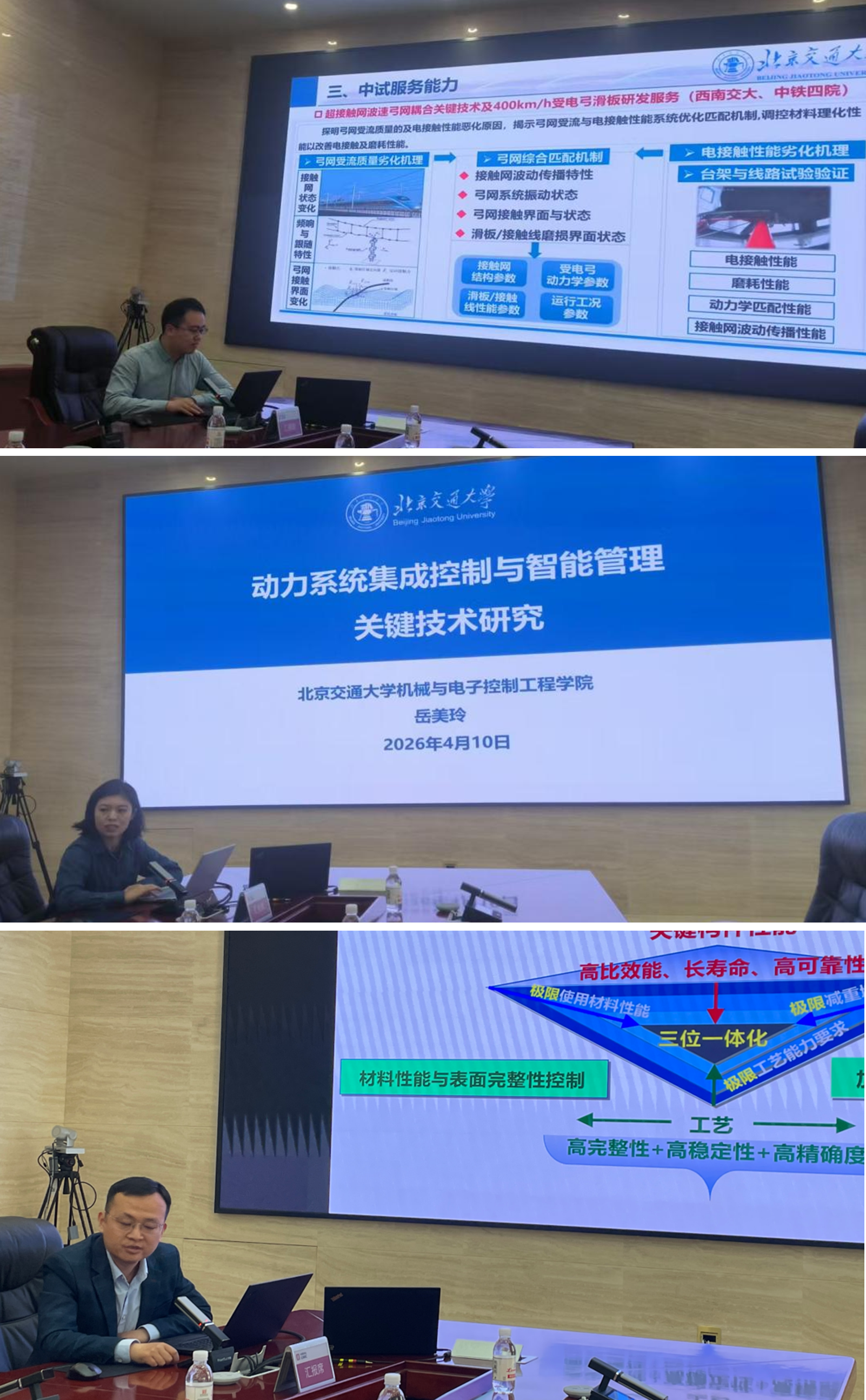 王文静代表学院对中车四方股份公司多年来在人才培养、科学研究等方面给予的支持和帮助表示感谢。她希望“十五五”期间,进一步深化产教融合、科教融汇,推动人才培养与企业需求精准对接,实现更多科研成果向企业应用高效转化,以共建创新研究院为契机,构建长效的产学研协同机制。李洪萌介绍了p站概况 和北交雄安创新研究院规划,教师代表分享了在智能制造、结构可靠性设计、先进润滑、新能源等方面的科研成果。