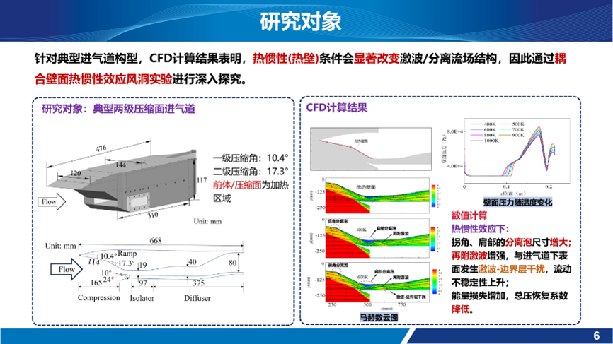 王少展在会上报告了题为《进气道压缩面壁面温度分布与换热特性研究》的研究成果。针对典型进气道两级压缩面构型,采用基于内置加热单元的流-热耦合风洞实验技术,实现高超声速飞行器减速返回阶段的热环境特征模拟。结合瞬态测量手段,探究了壁温高于来流总温工况下的壁面温度分布、传热特性和壁面热效应对分离流动的影响。基于实验数据,开发了适用于该飞行阶段的分段式半经验传热关联式,为宽速域飞行器的精细化热防护设计提供了数据支撑。